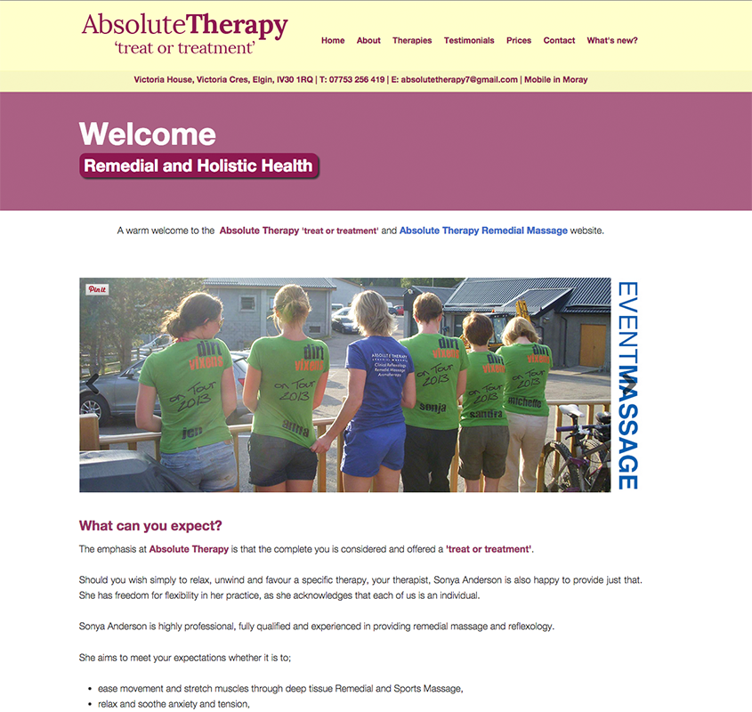 The new Absolute Therapy website now live. I was asked to create a calm, peaceful yet professional website for Sonya Anderson of Absolute Therapy. We worked closely together on this project and the client was extremely happy with the final result.